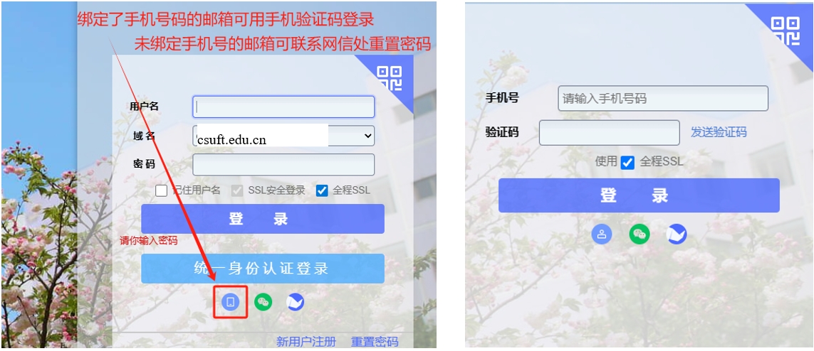 在浏览器地址栏中输入邮箱地址https://https-mail-csuft-edu-cn-443.webvpn.csuft.edu.cn,并按提示用手机验证码(或输入用户名密码)进入邮箱。